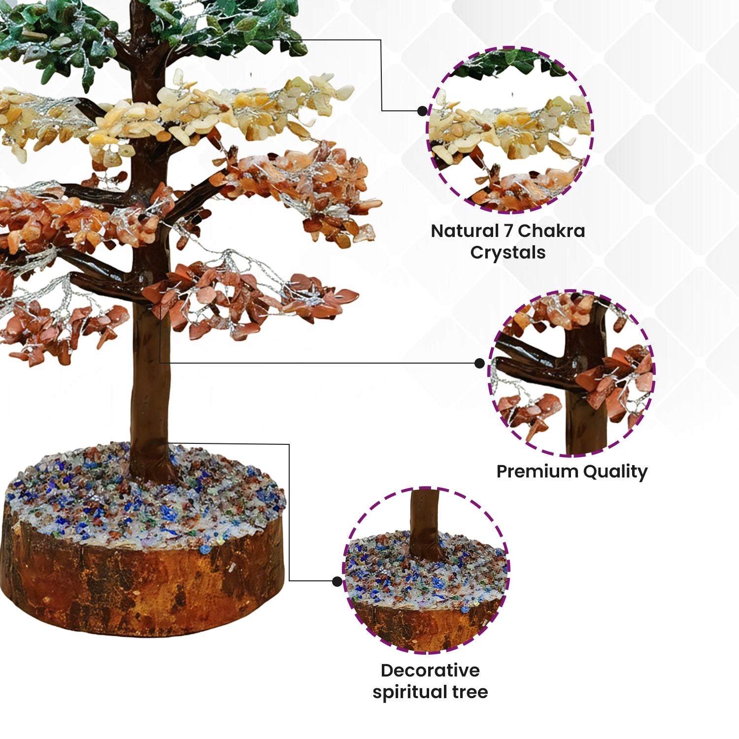 β’ Material : Natural 7 Chakra Crystals with Wire Tree & Base.