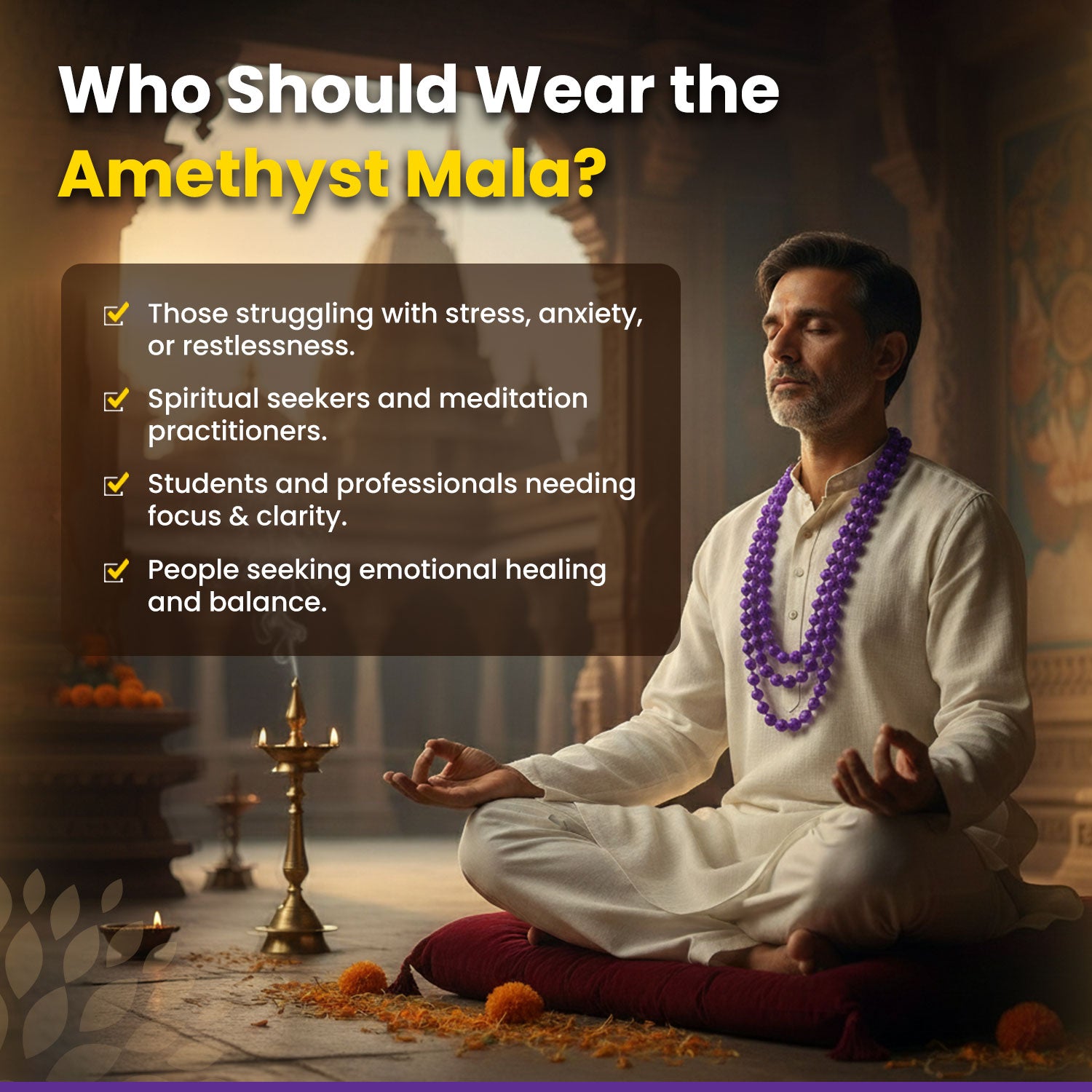 Embrace calmness and higher wisdom with the Amethyst Mala, known as the Stone of Spiritual Awakening. Its soothing purple glow balances your mind, relieves stress, and enhances spiritual connection. Perfect for meditation, healing, or everyday wear, this mala shields from negativity while guiding you toward clarity and peace.