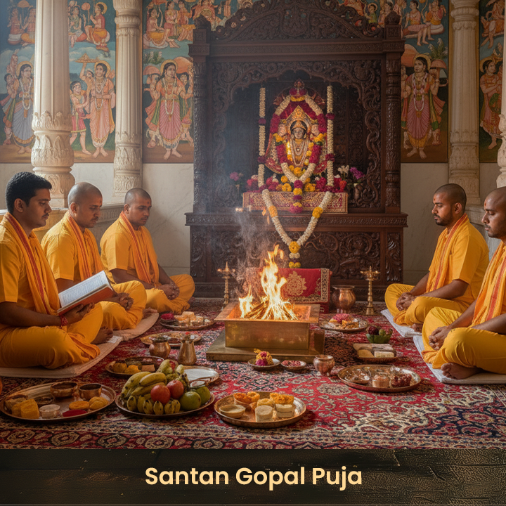 Santan Gopal Puja is a sacred Vedic ritual performed to bless couples with healthy children and resolve fertility challenges. This ancient ceremony honors Lord Krishna in his form as Santan Gopal, the divine protector of children and offspring. Devotees perform this puja to overcome conception difficulties, ensure safe pregnancies, and invoke blessings for the birth of virtuous and intelligent children. The ritual also protects existing children from health issues and negative influences. Rooted in thousands of years of spiritual tradition, Santan Gopal Puja channels divine grace to fulfill the deep desire for parenthood, strengthen family bonds, and ensure the well-being and prosperity of your children throughout their lives.