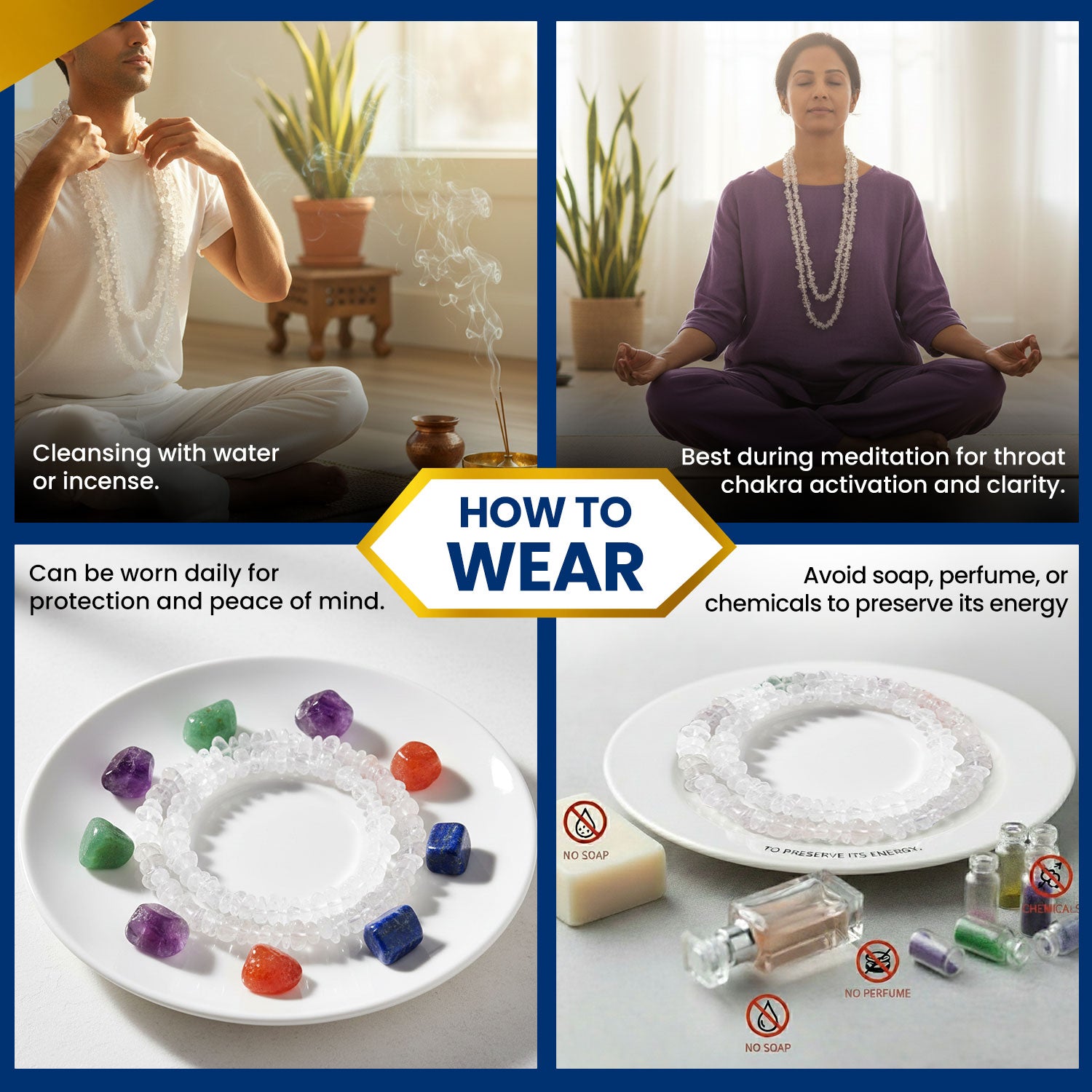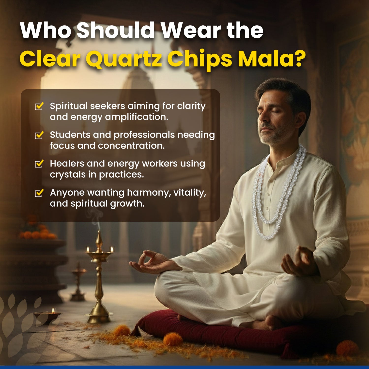 The Clear Quartz Chips Mala is known as the βMaster Healerβ of crystals. Its transparent, luminous appearance resonates with clarity, energy amplification, and spiritual growth. This mala cleanses, balances, and enhances both the wearerβs energy and the energies of other crystals. Ideal for meditation, healing, and daily wear, it promotes focus, clarity of thought, and spiritual awakening.