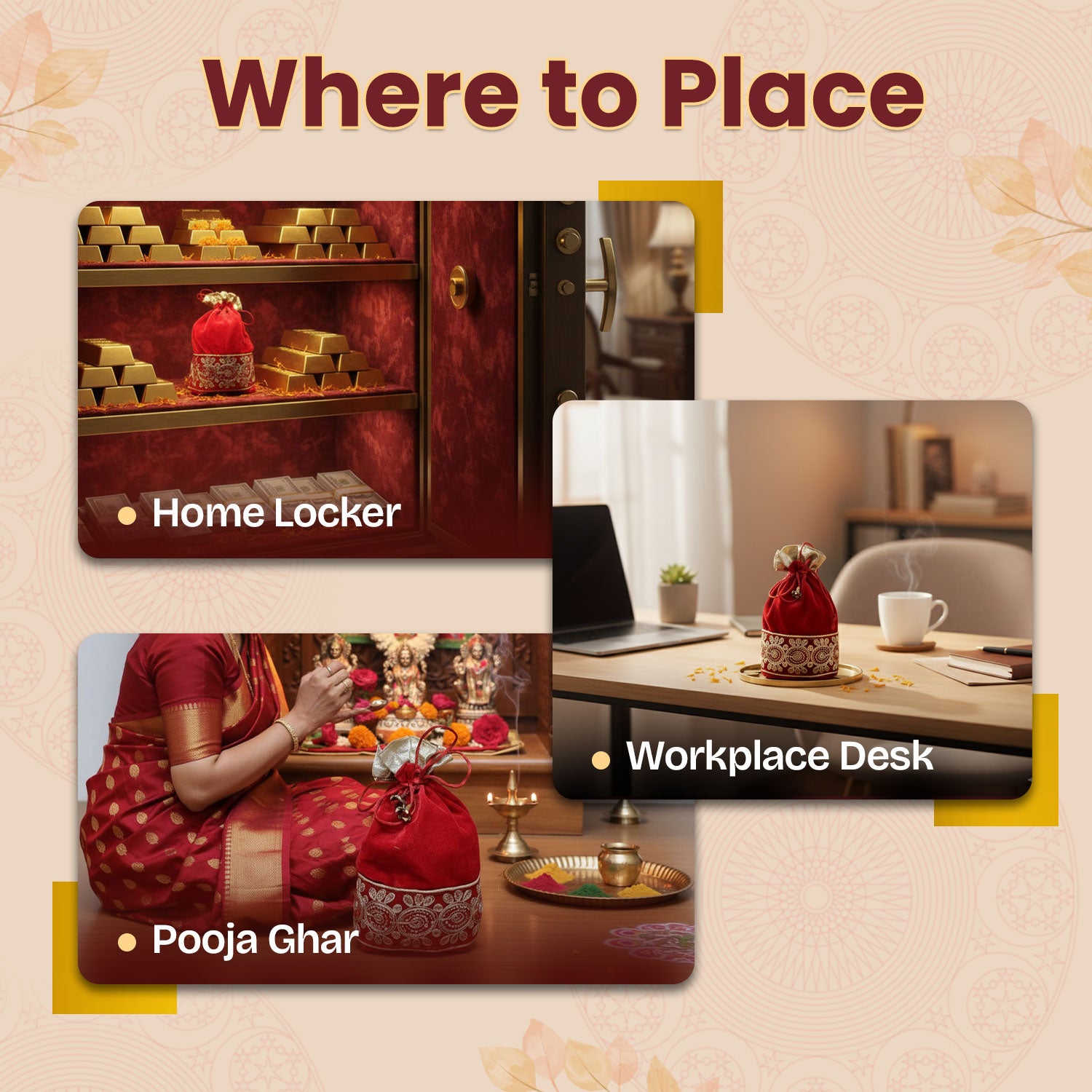 Place the Dhan Vriddhi Potli in your locker, temple, or cash area on a Friday or Diwali day after lighting a diya and Chanting “Om Hreem Shreem Lakshmi Kuberaaya Namah”.