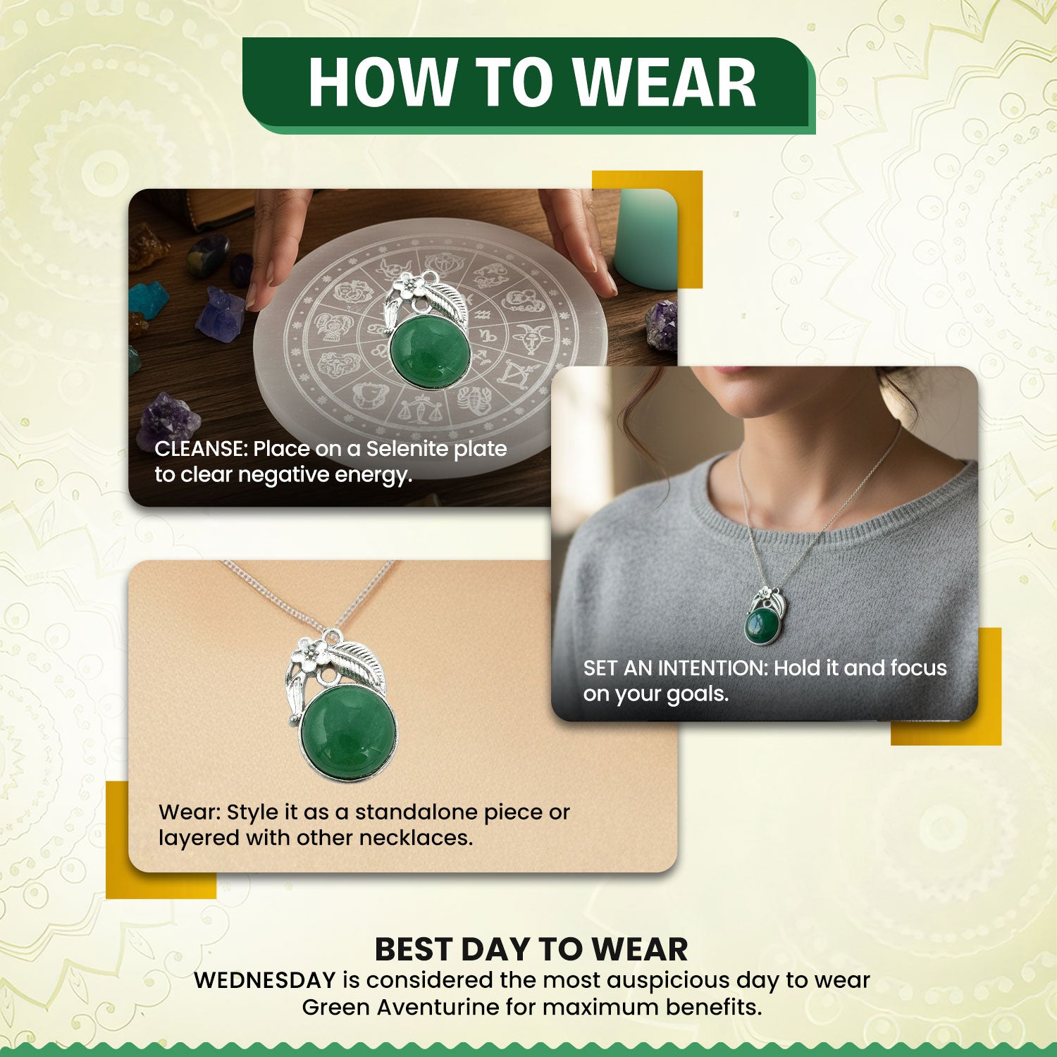 Wednesday is considered the most auspicious day to wear Green Aventurine for maximum benefits.