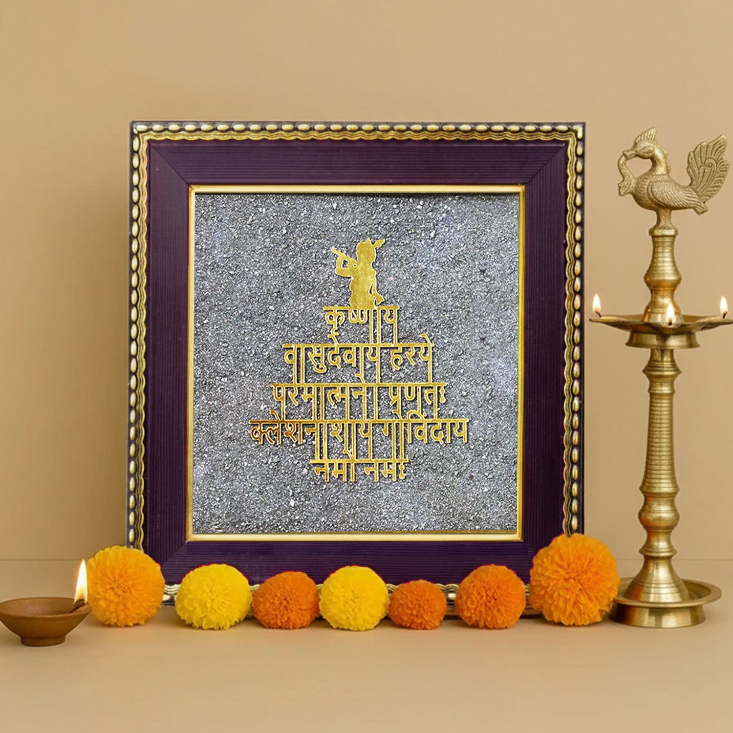 The Krishna Vasudeva Mantra Frame carries the sacred vibrations of Lord Krishna’s divine name. Known to invoke love, devotion, and protection, this mantra removes sorrows and fills life with bliss. The beautifully designed frame radiates positivity, bringing peace and spiritual strength into your space. Ideal for worship, meditation, or gifting, it reminds us of Krishna’s eternal presence. Placing this frame at home attracts divine grace, harmony, and happiness.