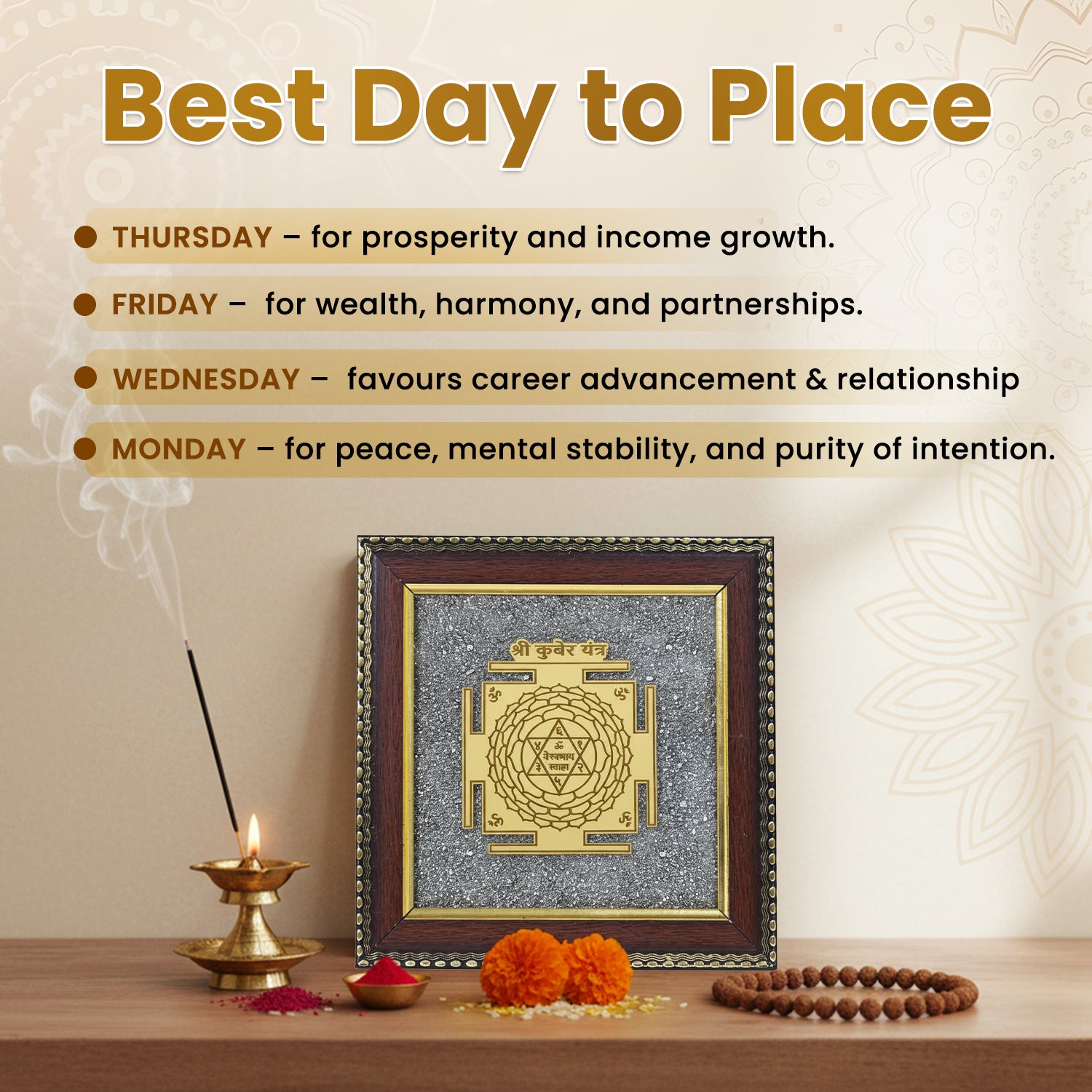 • Friday – for wealth, harmony, and partnerships.