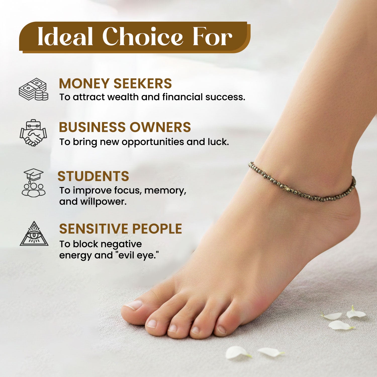 Bring confidence, prosperity, and grounding energy into your daily life with this beautifully crafted Pyrite Anklet. Known as the Stone of Wealth and Protection, pyrite is believed to attract abundance while shielding the wearer from negative energies. Designed to be both spiritually powerful and stylish, this anklet is perfect for everyday wear.