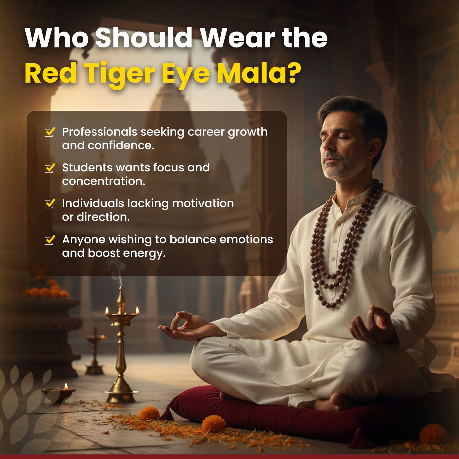 Improve your inner strength and confidence with the Red Tiger Eye Mala. Known as the stone of vitality and motivation, it awakens passion, sharpens focus, and brings grounding energy. Its deep reddish-brown sheen reflects courage and determination, empowering you to face challenges with clarity and drive. A perfect companion for those seeking stability, ambition, and balanced energy in life.