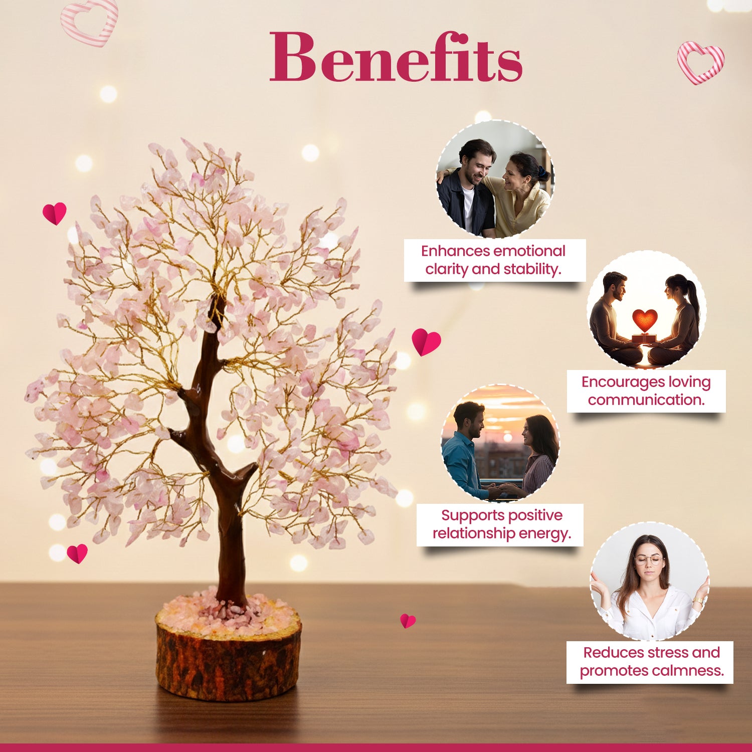 The Rose Quartz Tree is a beautiful decorative piece handcrafted with soft pink rose quartz beads and golden wire branches. Known as the Stone of Love, rose quartz symbolizes compassion, emotional healing, and harmony. This elegant crystal tree enhances the beauty of any space while spreading loving and peaceful energy.