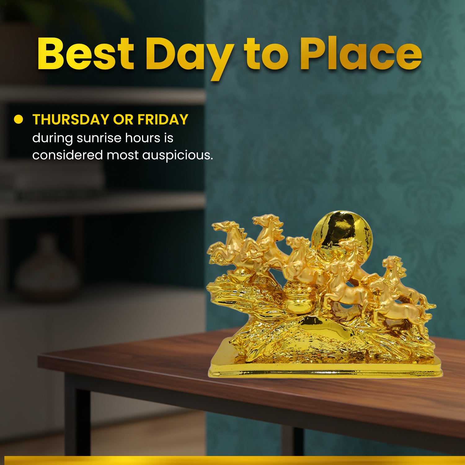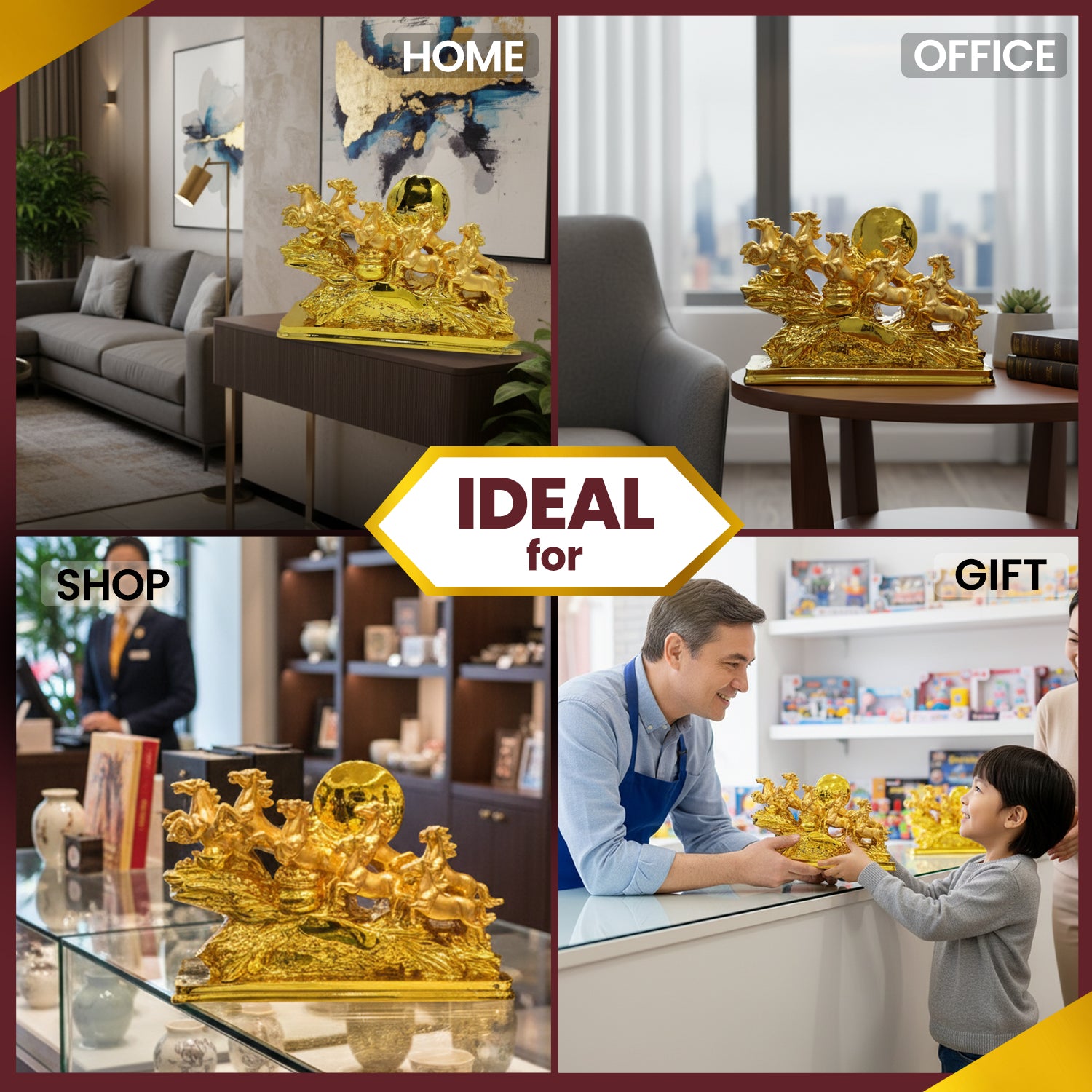 Seven Golden Horse idol is beautifully crafted with a radiant golden finish, this auspicious decor piece blends the ancient principles of Vastu and Feng Shui to attract wealth, ward off negativity, and enhance harmony in your home or office. Adorned with symbolic lucky charms, this item is more than just decoration. it’s a spiritual enhancer.