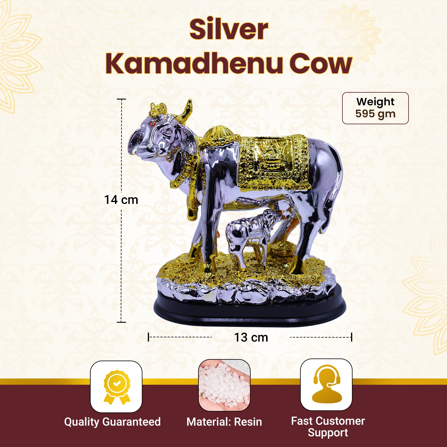The Silver Kamdhenu Cow statue is a sacred and powerful symbol of abundance, fertility, and divine blessings in Hindu tradition. Kamdhenu, the celestial cow and mother of all cows, is believed to fulfill all desires and bring prosperity to the household. Crafted in a beautiful silver finish, this statue features Kamdhenu with a calf, adorned with miniature deities on her body, representing various divine energies.